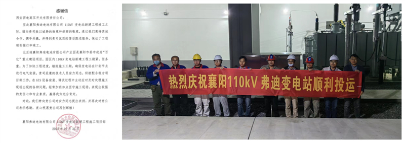 10月31日,比亚迪襄阳弗迪电池产业园110kV变电站顺利带电运行,正式投入使用。与此同时,PA视讯官网收到襄阳弗迪电池有限公司发来的感谢信,对PA视讯官网表示感谢,并对相关技术服务人员的敬业态度和优质服务给予了充分肯定和高度评价。